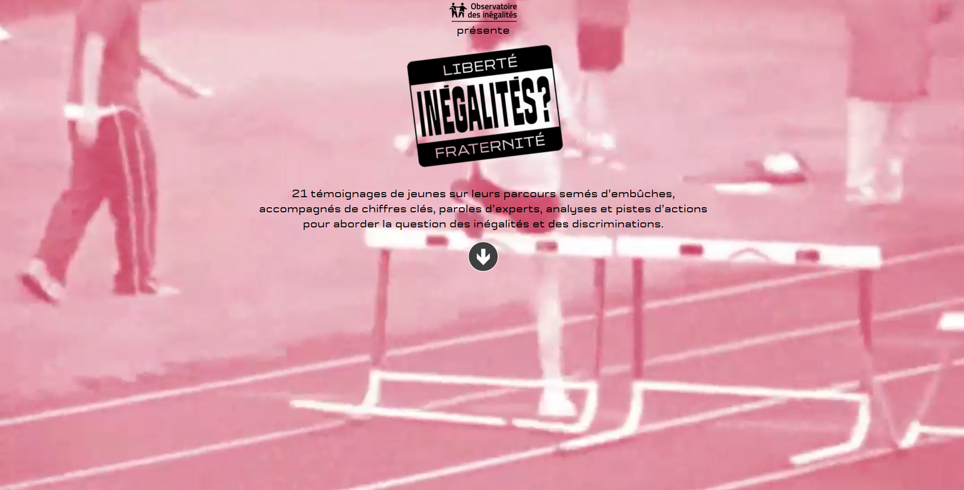 A la fois site internet et documentaire, le webdocumentaire « Liberté, Inégalités ?, Fraternité » de l'Observatoire des inégalités se veut un outil interactif et ludique pour parler d'inégalités et de discriminations. En partant de témoignages de jeunes, il invite à remettre en question les stéréotypes sociaux et à prendre conscience des mécanismes de reproduction sociale.