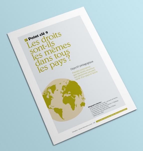 Découvrez le sommaire : Manuel complet 1/ Le droit c'est quoi ? 2/ Qui crée le droit ? 3/ Tous égaux devant la loi ? 4/ Qui protège le droit et les droits ? 5/ Les sanctions sont-elles les mêmes pour tous ? 6/ Moins de 18 ans, quels droits ? 7/ Est-ce que les droits s’appliquent tout le temps ? 8/ Le droit international et le droit européen, c’est quoi ? 9/ Les droits sont-ils les mêmes dans tous les pays 10/ Défendre nos droits, changer la loi ! 11/ Monde numérique : quels droits ? Glossaire du manuel